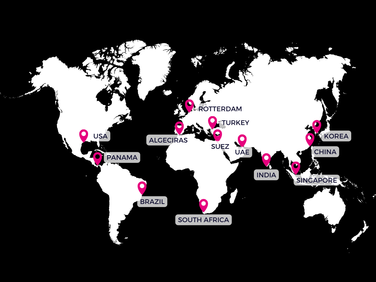 Singapore, China, Korea, UAE, Rotterdam/ARA range, Algeciras/Gibraltar range, Suez, Cape Town / South Africa Range, Panama, USA, India, Brazil